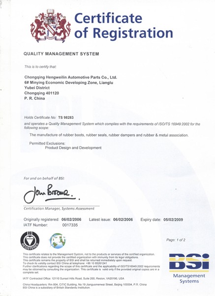 重庆恒伟林汽车零部件有限公司成立于1999年,位于重庆市渝北区空港工业区,约800名员工,是一家专业设计制造橡胶件,橡胶金属组合件,PU/EPDM 发泡,冲压及注塑件的厂家。 公司的主营产品为:橡胶保护套、橡胶波纹管、橡胶衬套、防尘罩、减震断音缓冲橡胶件、减震与转向衬套类橡胶金属组合件等。 产品主要用在汽车/摩托车的传动、控制、转向、减震、发动机等系统上,广泛用于在宝马、福特、丰田、大众、雷诺、沃尔沃、雪铁龙、日产、本田等主流车型上。 公司已经通过了IATF16949质量管理体系和ISO14001 环境管理体系认证。被多家客户评为“优秀配套单位”、“质量先进单位”。